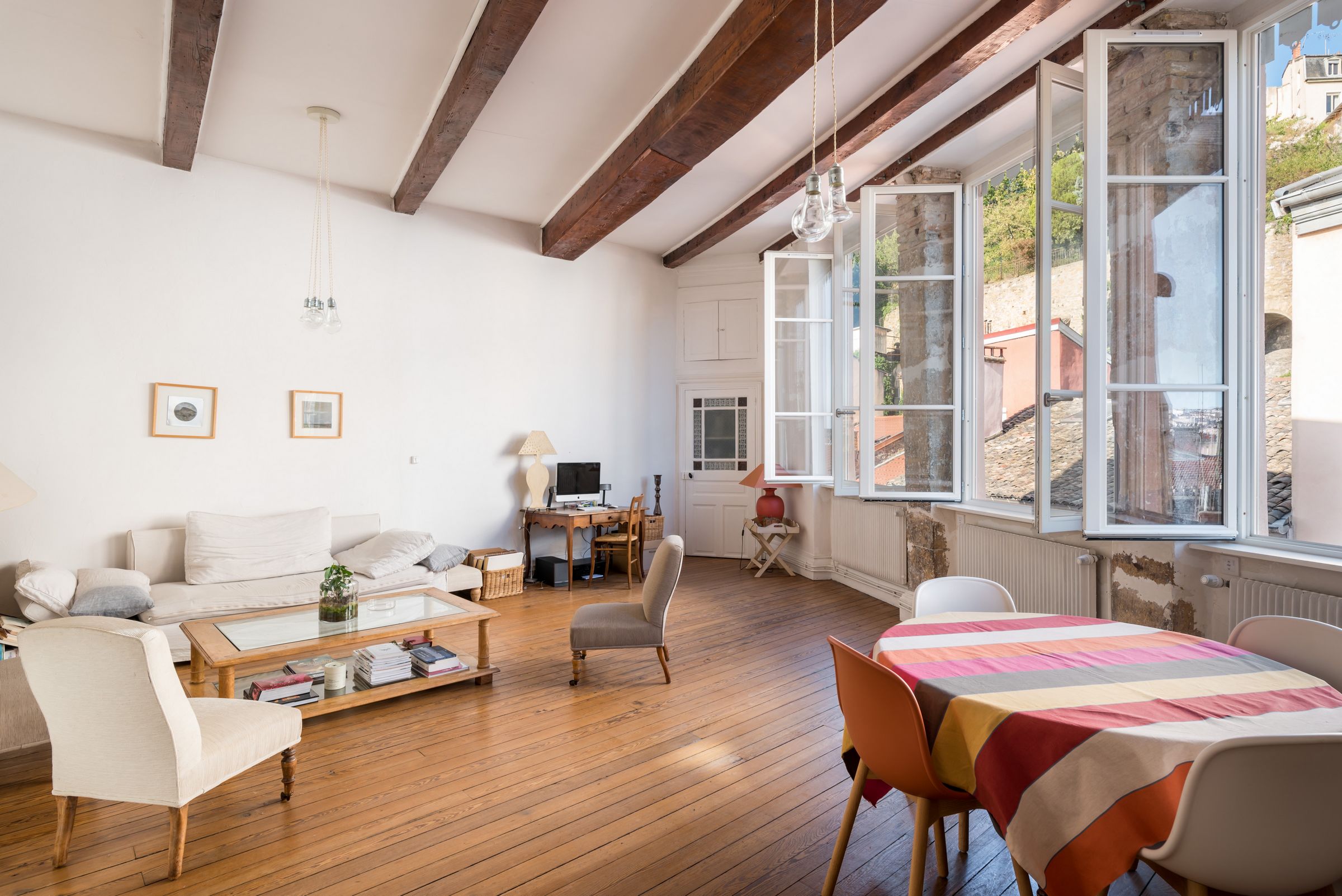 Il se compose d'un hall d'entrée, un grand séjour de 36m² avec une cuisine équipée semi ouverte avec une vue magnifique sur les toits, une salle de bain et des toilettes. Au second niveau, deux chambres avec vue sur Lyon ainsi qu'un grand espace rangement. Ambiance maison sous les toits pour cet appartement à l'atmosphère cosy.
