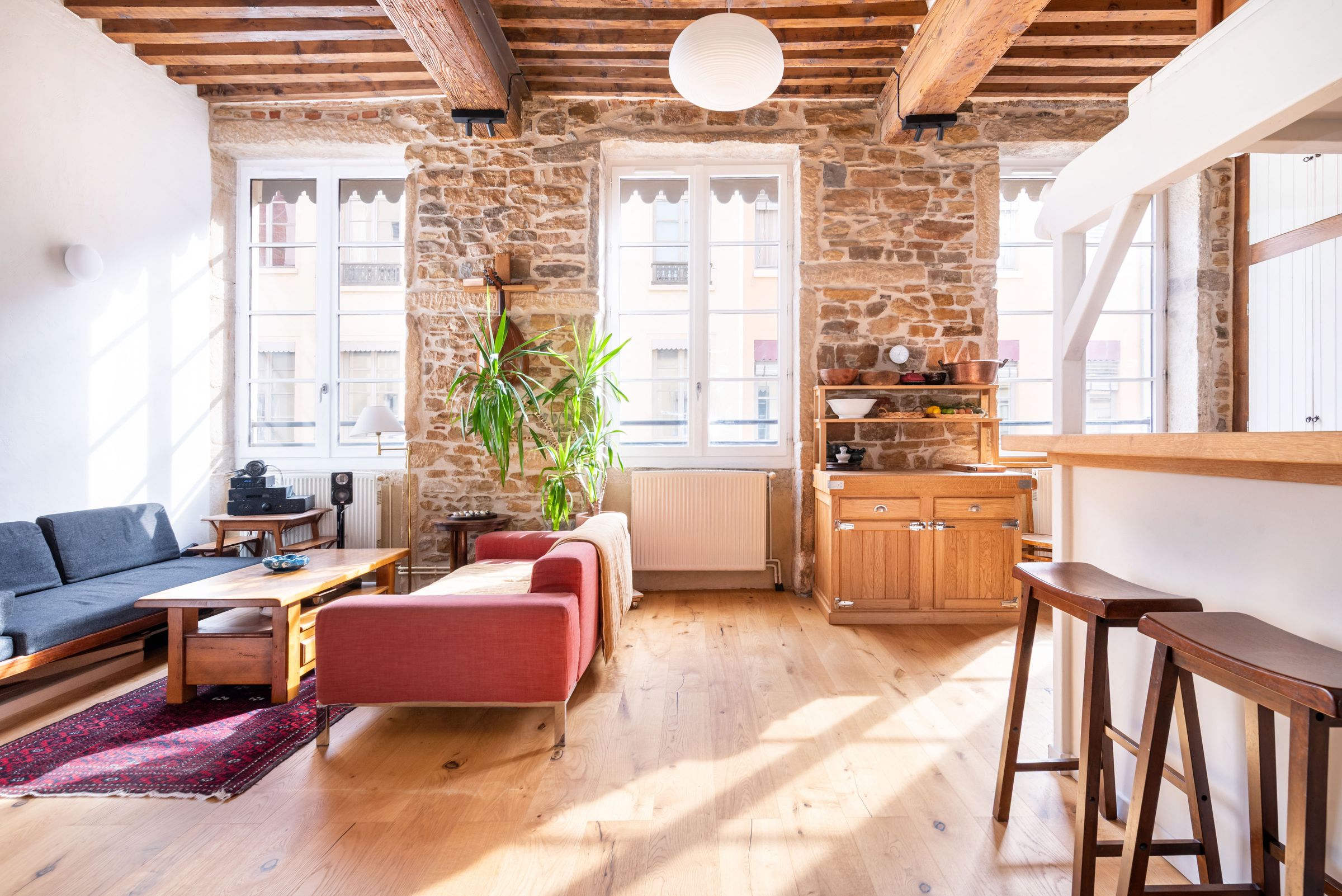 Lumineux et doté d'une très belle atmosphère, l'appartement séduit par la préservation de ses matériaux anciens (pierres apparentes, plafonds à la française) harmonieusement associés à des équipements plus contemporains, notamment dans la cuisine et la salle d'eau.