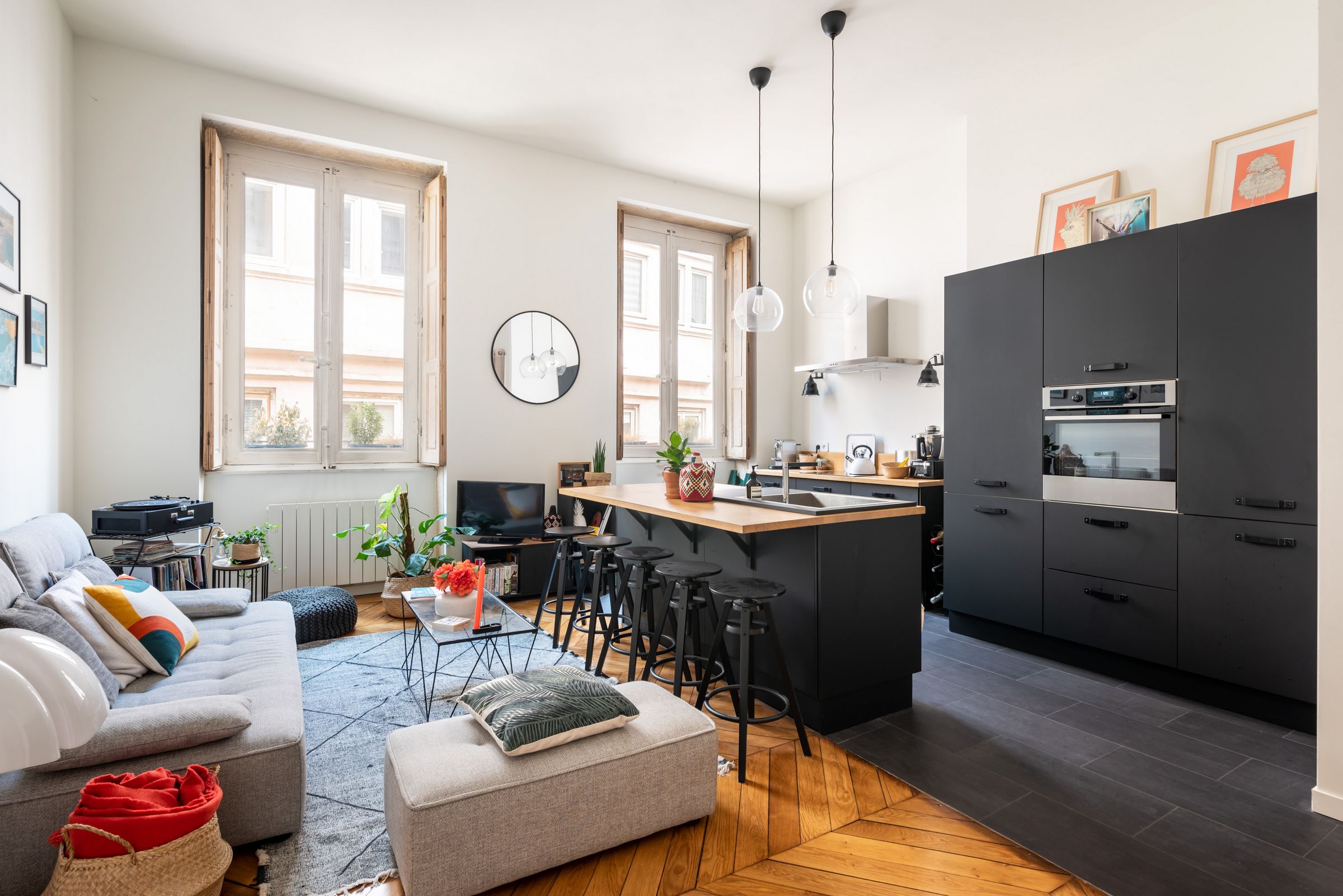 Dans une copropriété bien entretenue, au troisième et avant dernier étage desservi par ascenseur, cet appartement de type 2 pièces de 44m² a profité de rénovations particulièrement soignées avec tout le cachet et charme de l'ancien dans un esprit bourgeois : parquet chevron, pierres et hauteur sous plafond. Une rénovation pensée avec intelligence qui permet d'optimiser parfaitement les espaces.