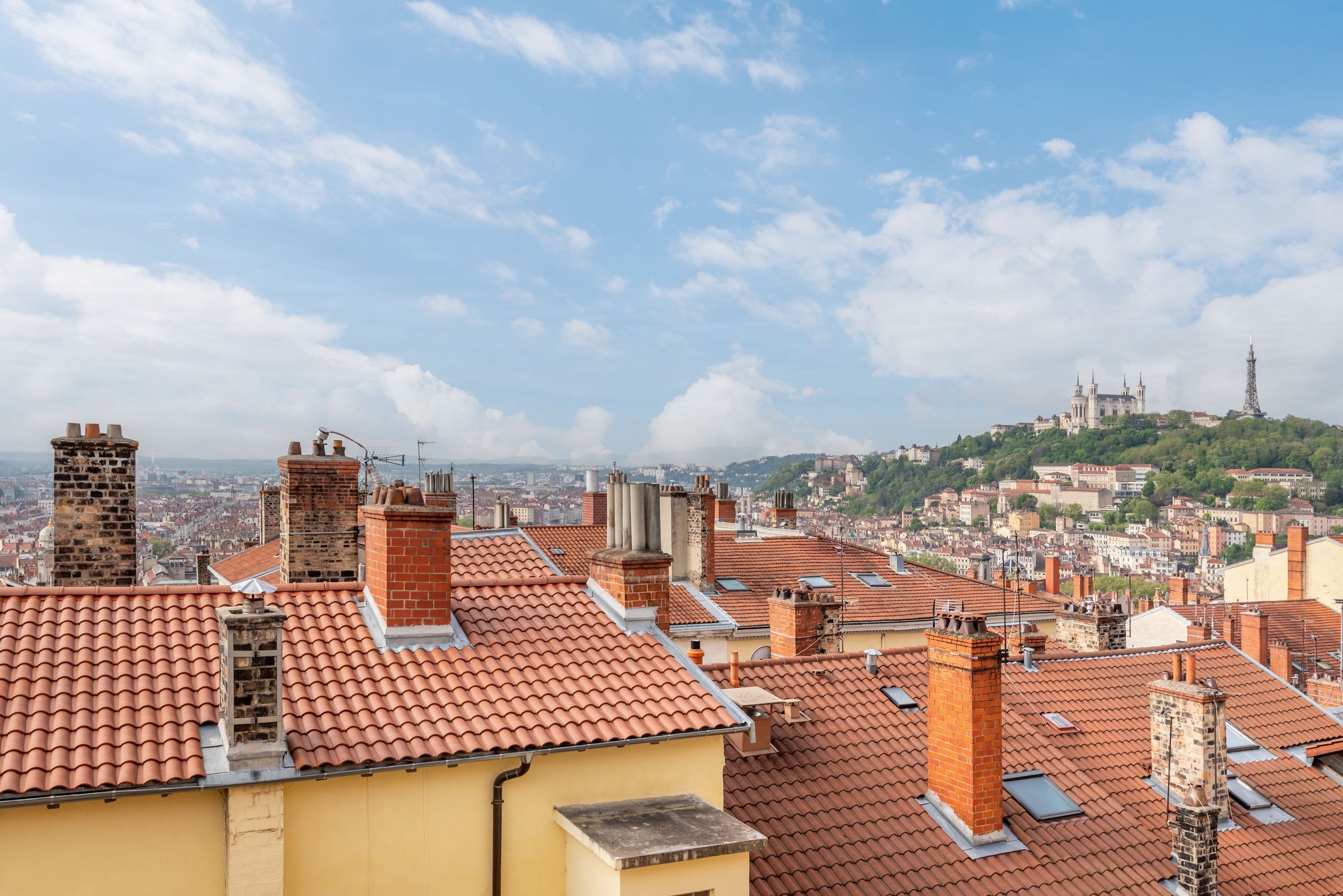 Niché au 6ème et dernier étage d'un immeuble canut (ascenseur jusqu'au 4ème étage), cet appartement profite de sa situation exceptionnelle en surplomb de la Presqu'île pour offrir une vue pour le moins saisissante sur la ville, ses toits et monuments.